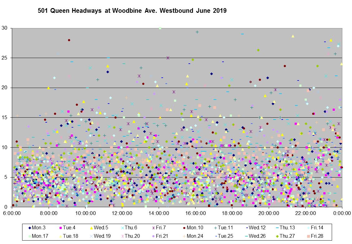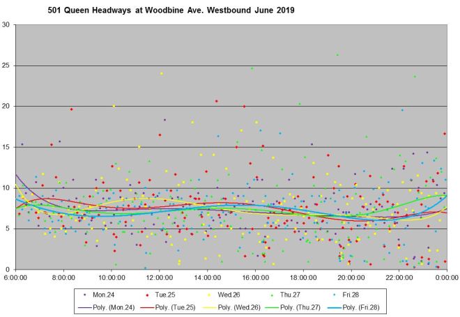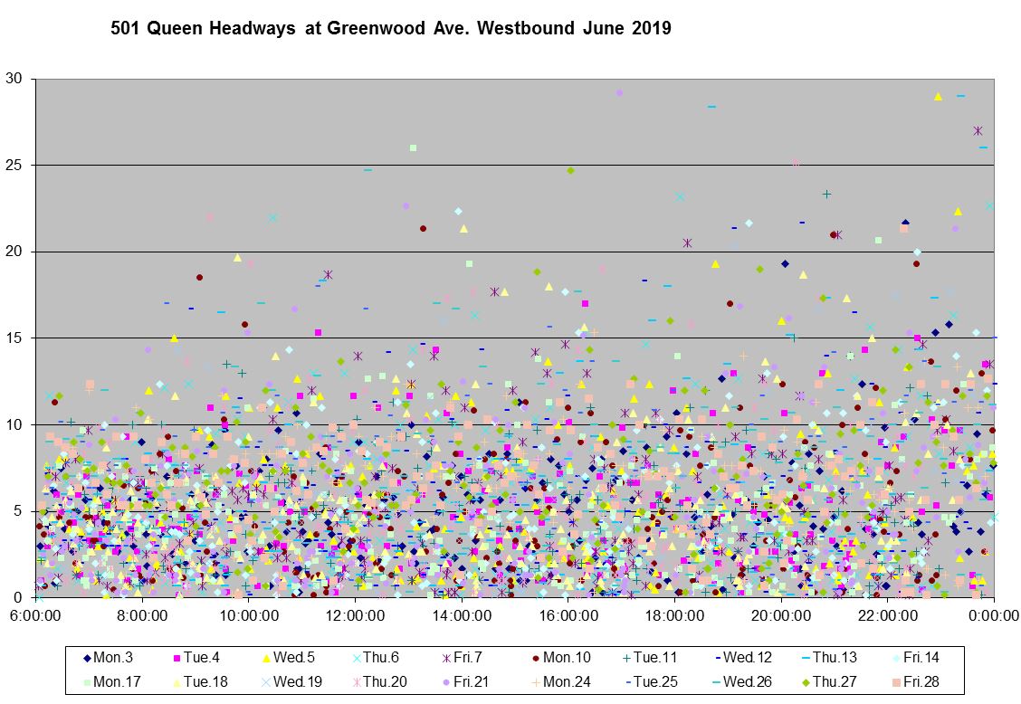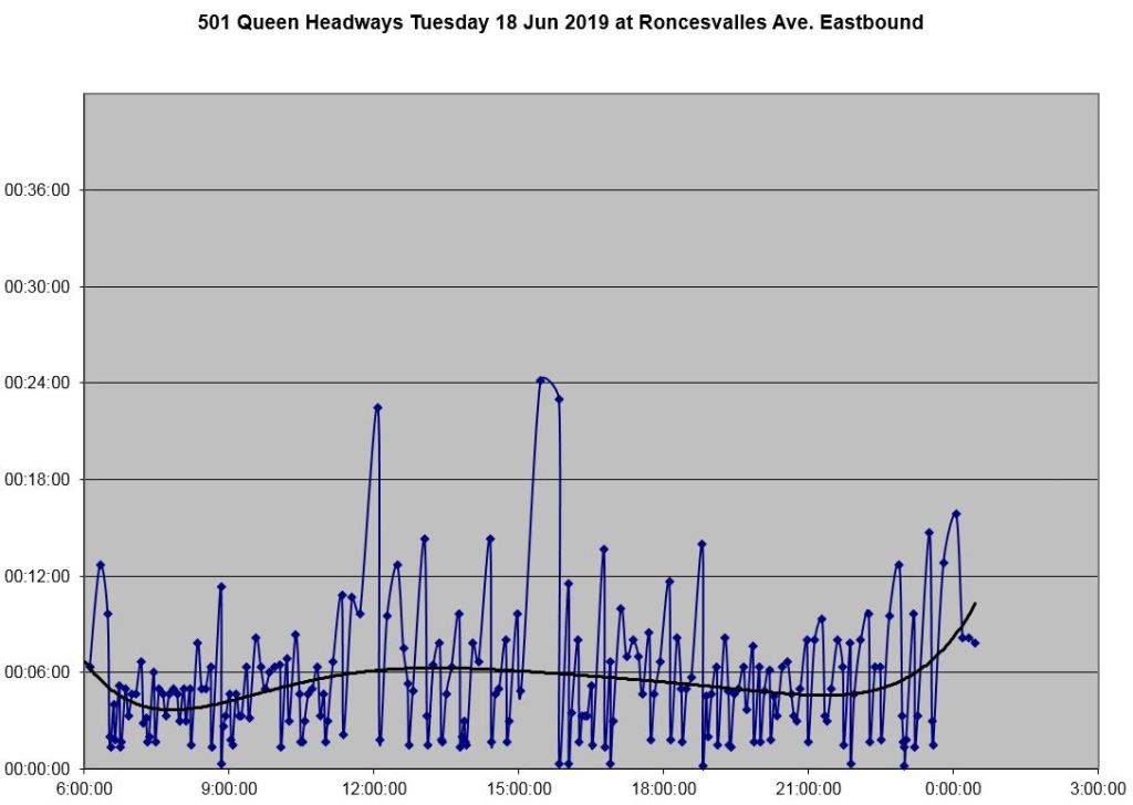 The chart below shows all trips westbound on Queen at two locations: Woodbine and Greenwood in June 2019. Time of day runs left to right, and the headway value bottom to top. Even without any formal statistical analysis, it is clear that most headways are smeared over a band from zero to ten minutes, and higher values are not uncommon.