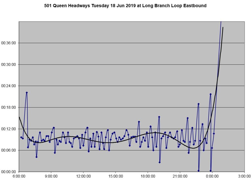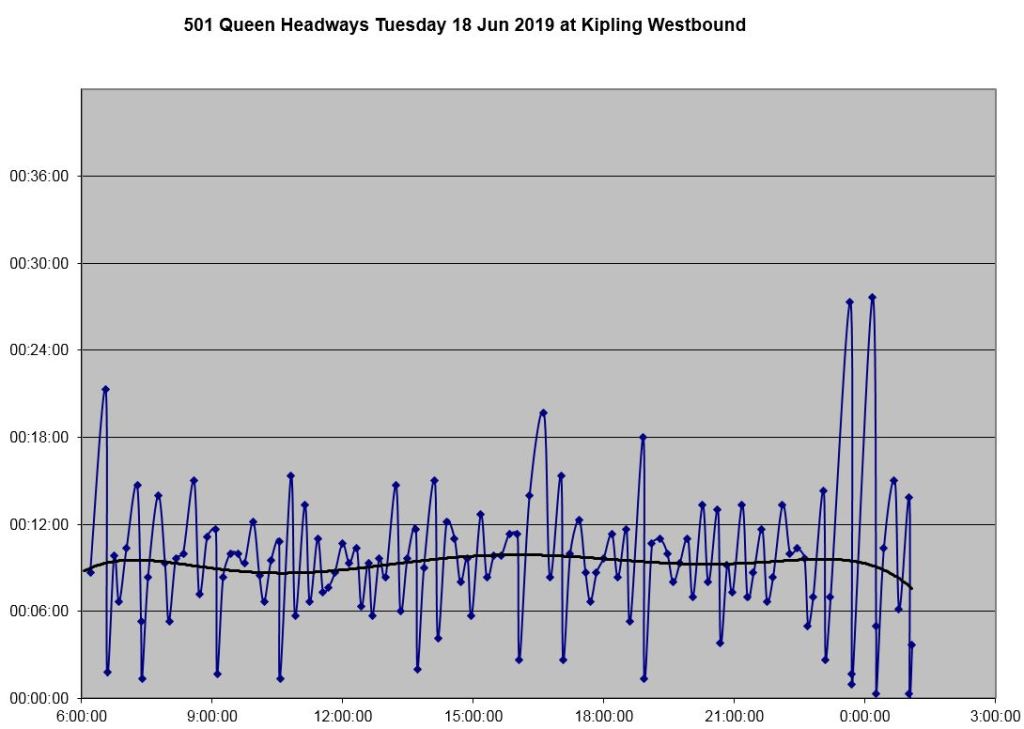 501 Queen is complex route where service is often disrupted. However, the western portion between Humber and Long Branch was better behaved when it operated as a shuttle. This shows a typical pattern for a simple route.