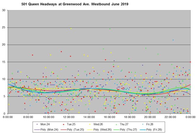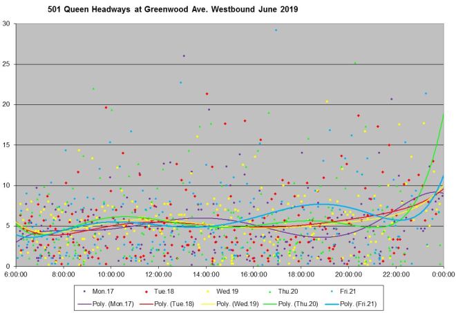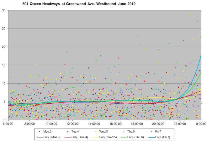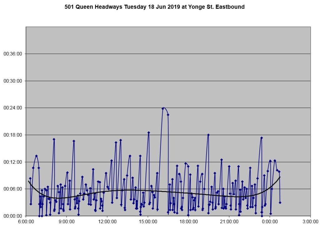 By the time this service reaches Yonge Street, the swings in headways are more pronounced.