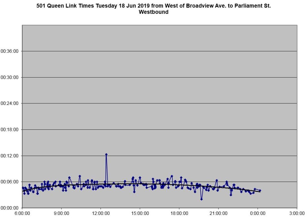Some segments have no change in travel times all day long. Except for one car that was held for some reason, there is no peak period effect in the stretch from Broadview to Parliament (among other parts of the route).