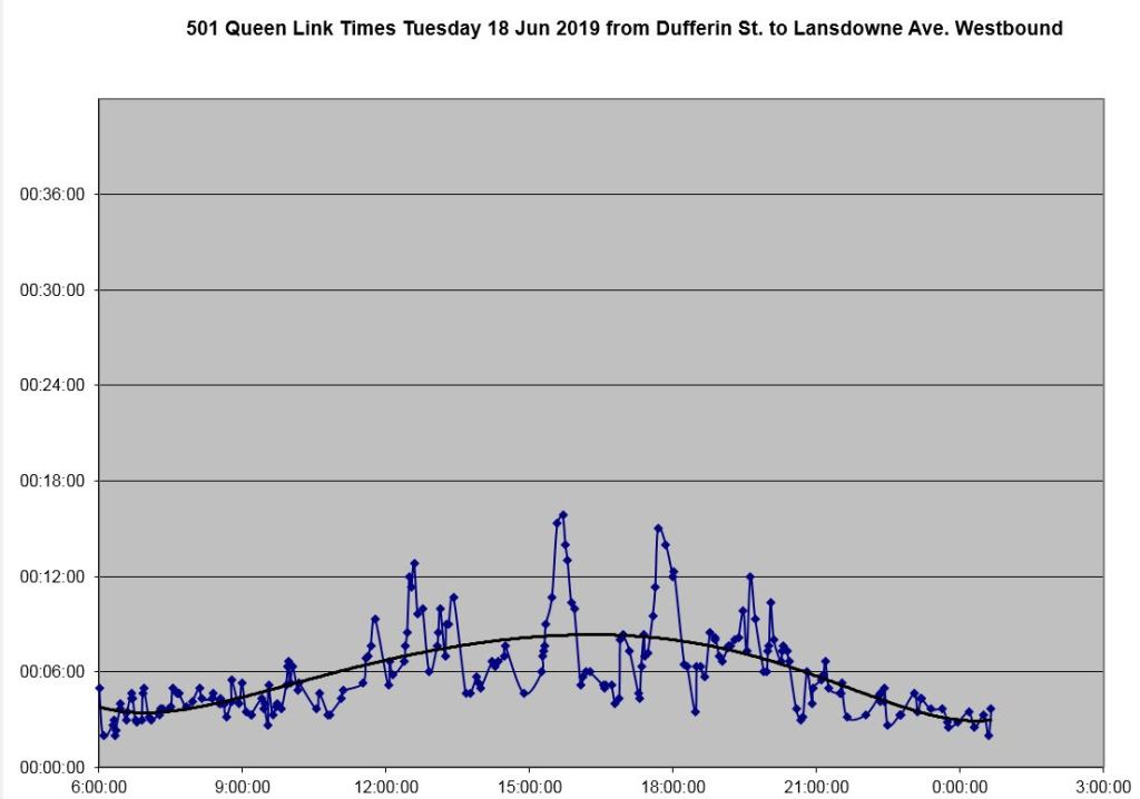 Although the charts here are for 501 Queen, the patterns seen here show up across the network with both bus and streetcar routes including those operating in reserved lanes.
