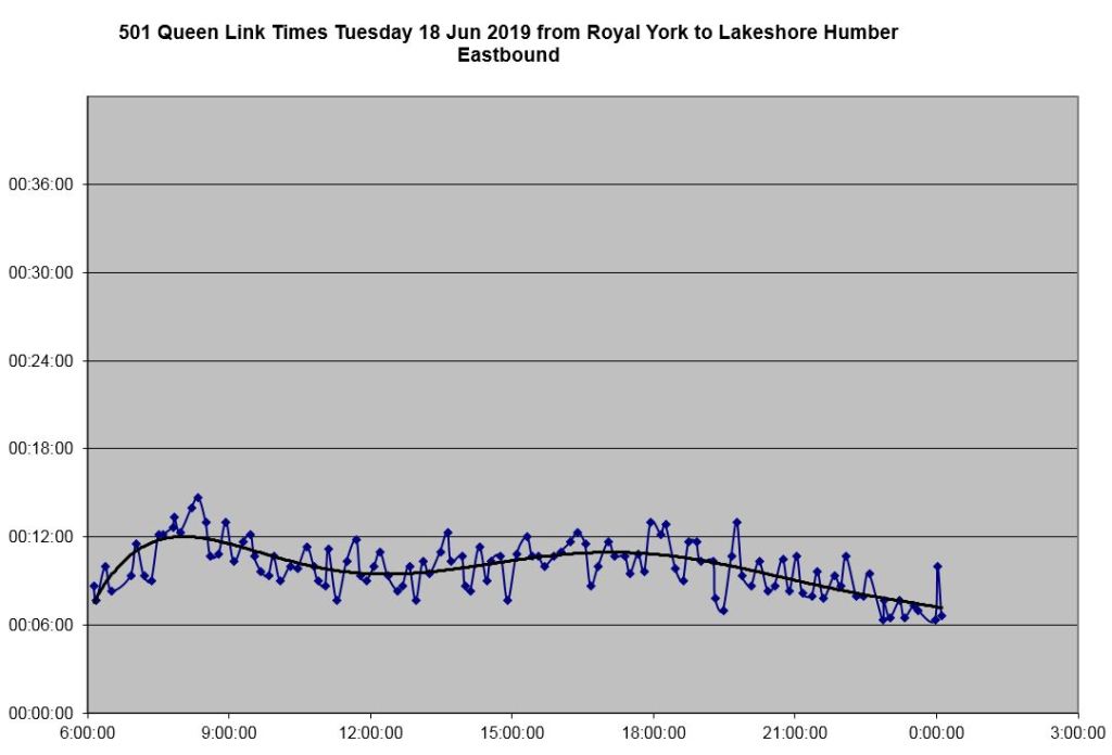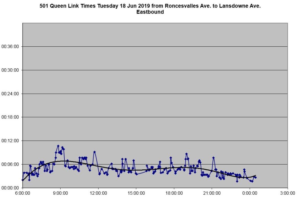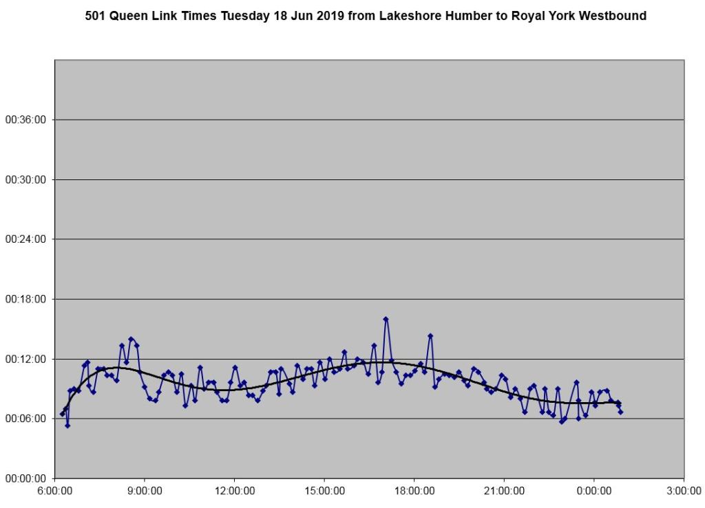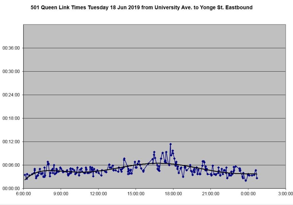 Travel times between points on a route tend to be a lot more stable than headways, although they will rise and fall depending on congestion, stop service time and special events. For June 2019, here are some examples for the following segments of the Queen car.