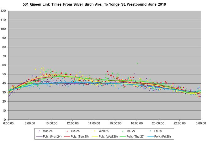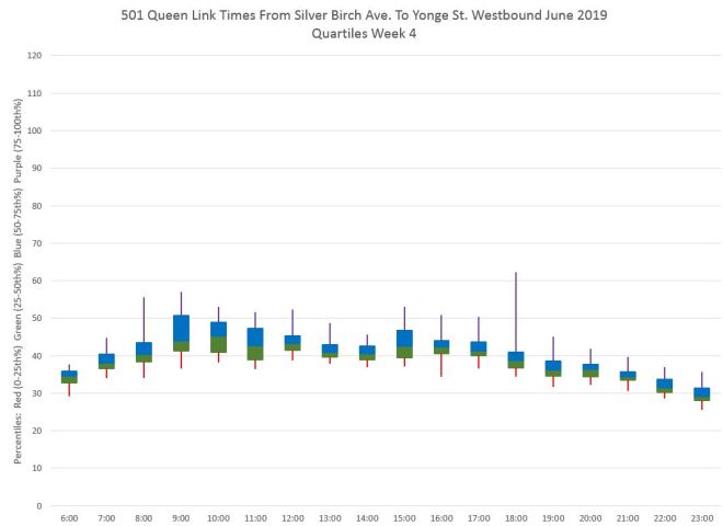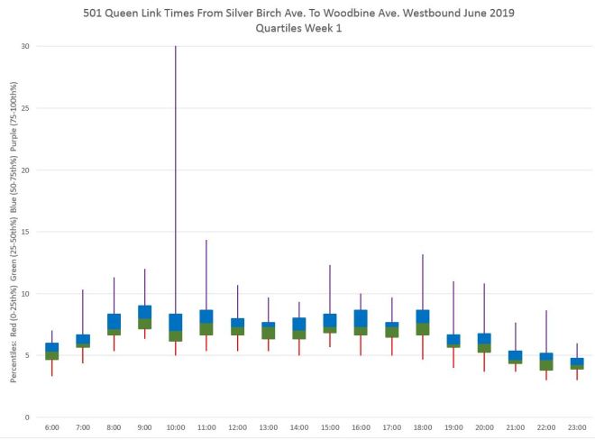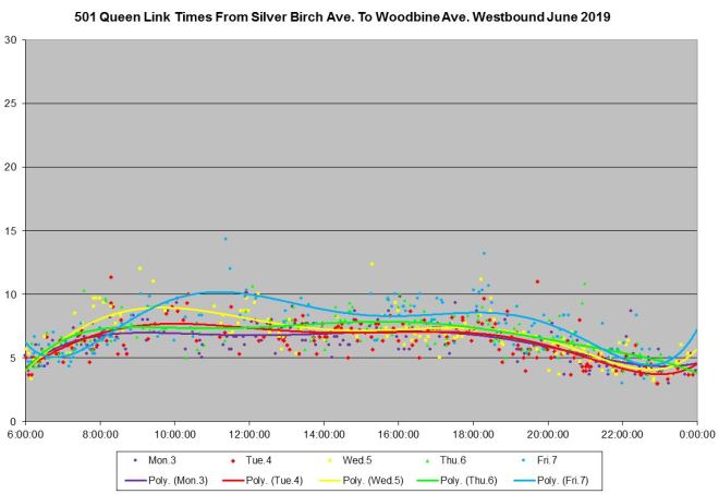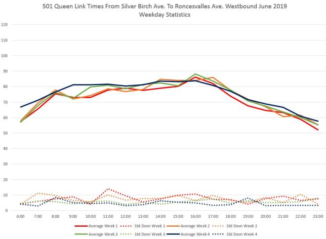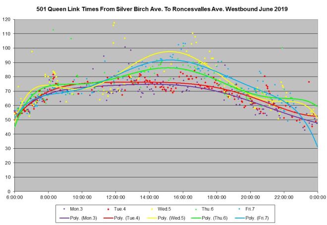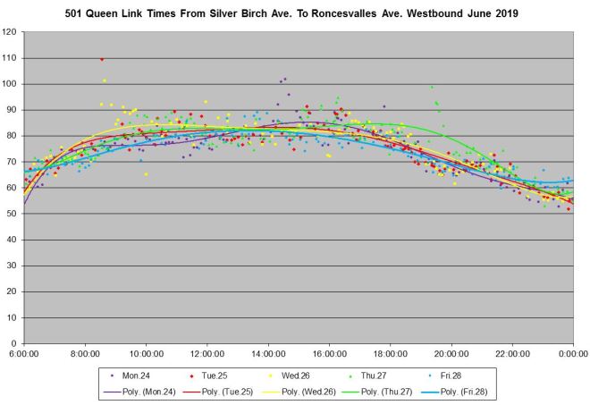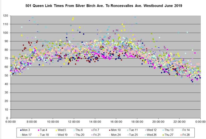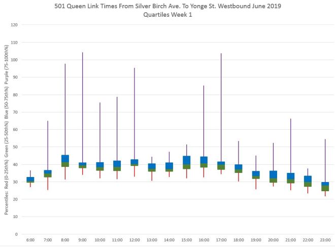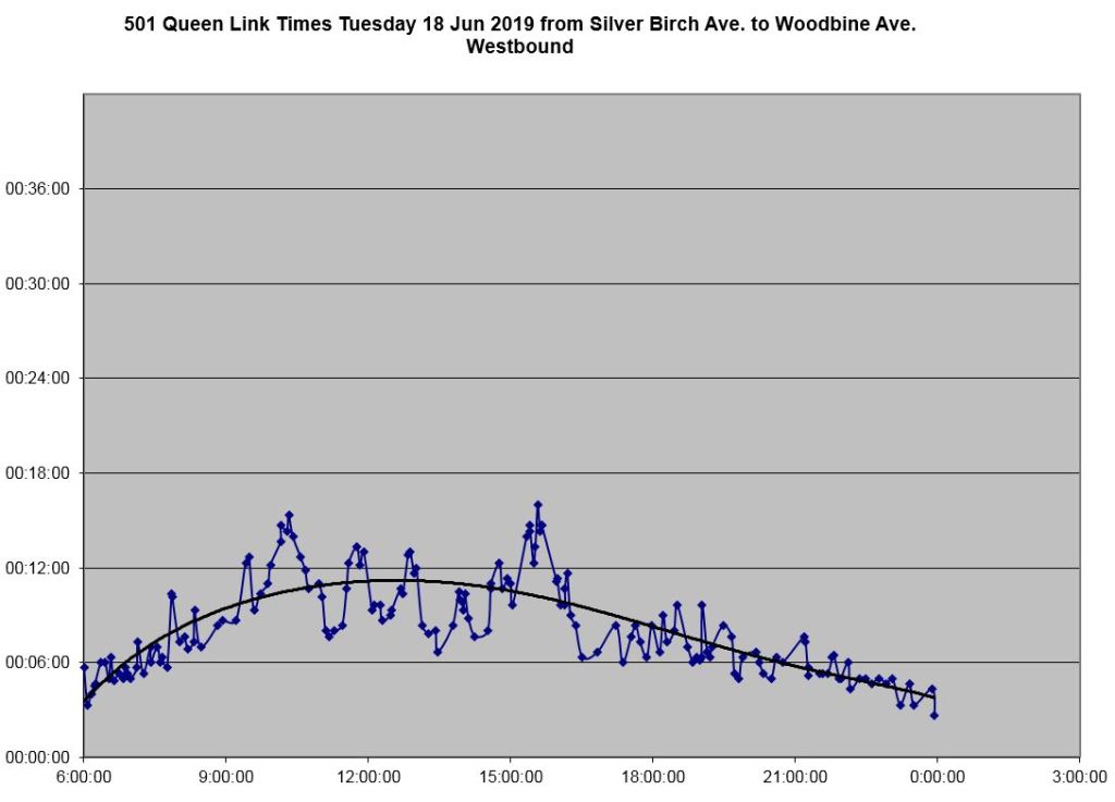 Travel times between points on a route tend to be a lot more stable than headways, although they will rise and fall depending on congestion, stop service time and special events. For June 2019, here are some examples for the following segments of the Queen car.