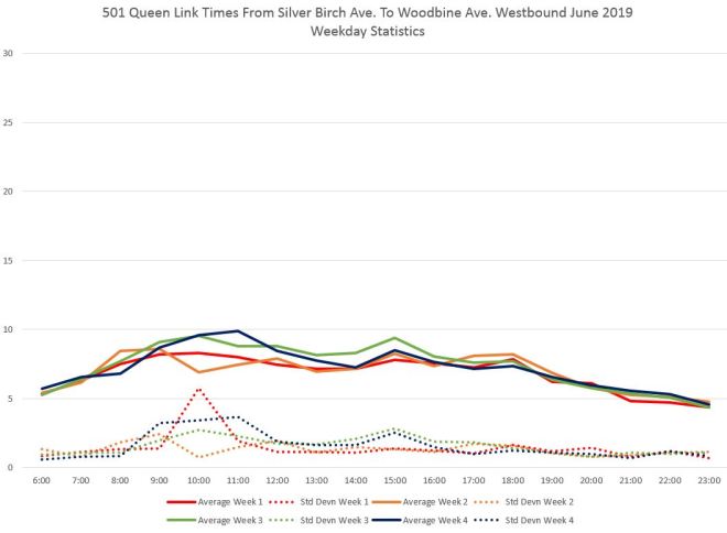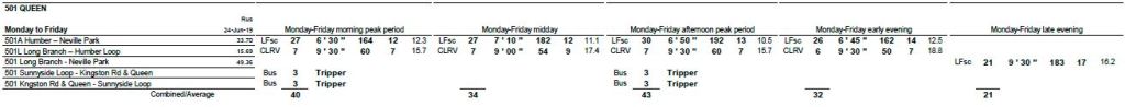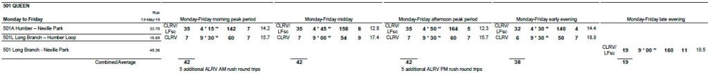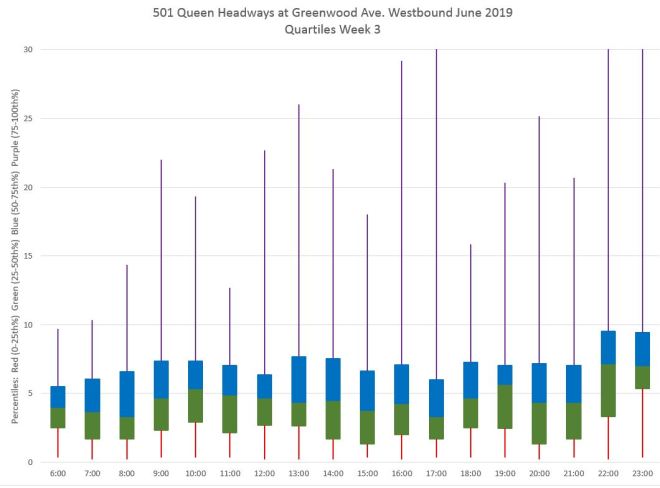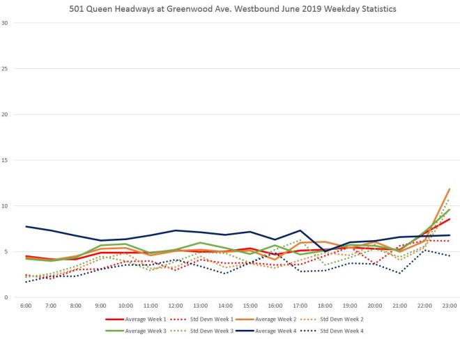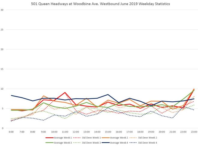 Here are the scheduled weekday headways for 501 Queen for weeks 1-3 of June, 2019, and for week 4 showing the changes (click to expand).