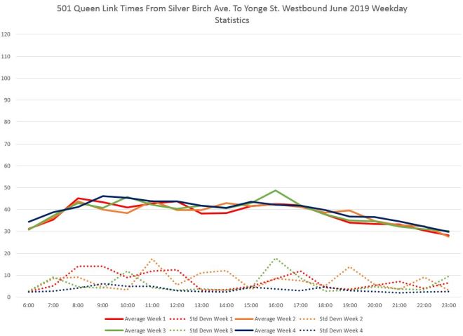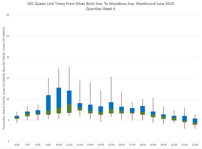 Here are the travel times westbound from Silver Birch (the first stop west of Neville) to Woodbine. Note that the longest travel times are between the peak periods. A fairly common pattern is for there to be longer times just after the AM peak and just before the PM peak because off-peak parking rules kick in reducing the street’s capacity while there is still heavier traffic. There have been adjustments to the “shoulder” peak parking and turning restrictions in many places, but there is an ongoing fight between merchants and motorists who want parking, and transit’s need for clear roads.