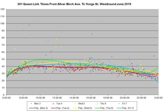 For the data between Silver Birch and Yonge, there are a scattering of points well beyond the main band of the data. Examination of the daily service charts shows that these cars laid over for an extended period at Russell Carhouse, probably because no operator was available for a crew change, and then continued on their way.