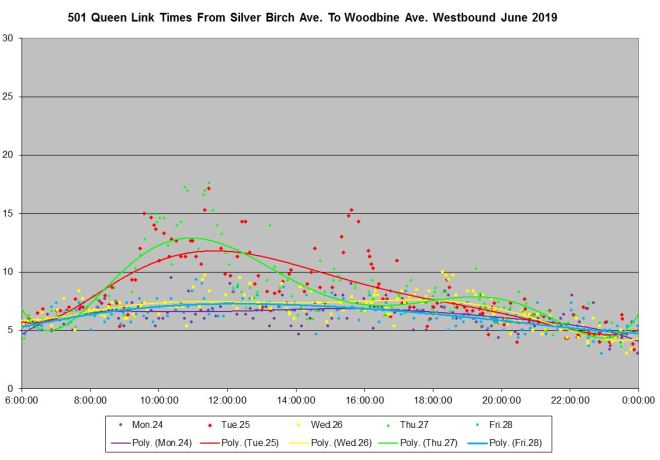 The full collection of data points shows that even through The Beach to Woodbine there is a band about 5 minutes wide which is rather large considering that the average lies near 8 minutes. Between the peaks, this can get worse. The light yellow triangles are data for June 18 for which a detailed service chart is linked earlier in the article, and which shows that the congestion built up westbound to Woodbine. The green diamonds are for June 27 when a similar problem developed after the AM peak until after noon. This is an example of how conditions are not always the same on a route from day to day.