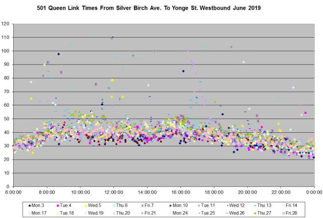 There is also a collection of points after 4 pm on Friday, June 21 with very long travel times. This was not one of the better days for the Queen car. A delay westbound at Greenwood (for which no eAlert was issued) held seven cars over a period of half an hour. When these cars reached Boulton (east of Broadview), they were held for another 40 minutes for what the eAlert described as a “mechanical problem”. This created a one hour gap in service into which only one car was short turned and that only as the delay was finally clearing. June 21, 2019, is a day worth examination in detail, but that is beyond the scope of this article.