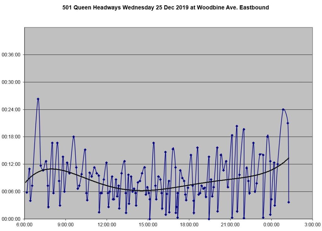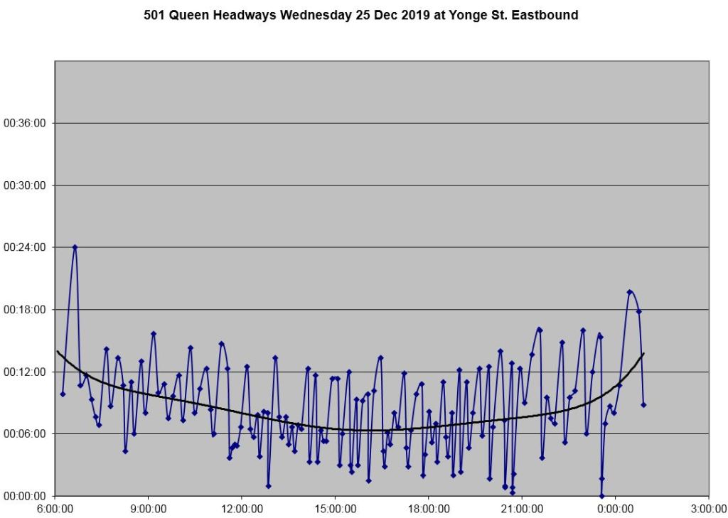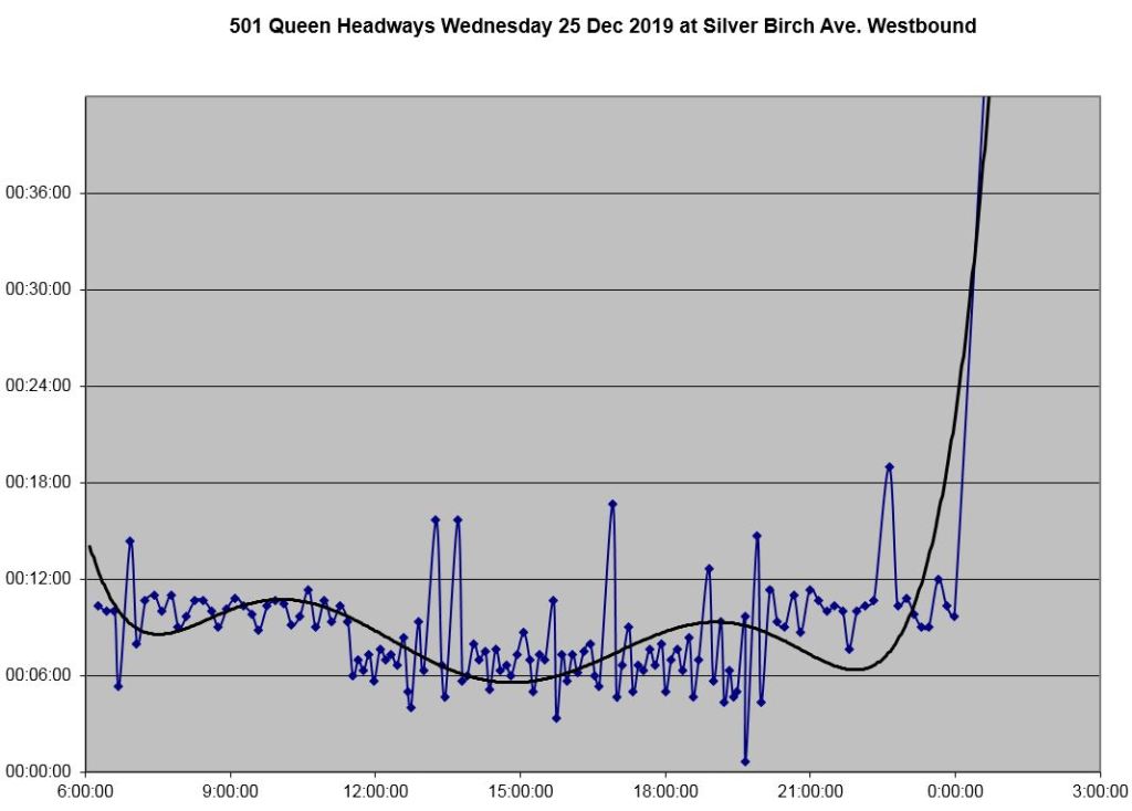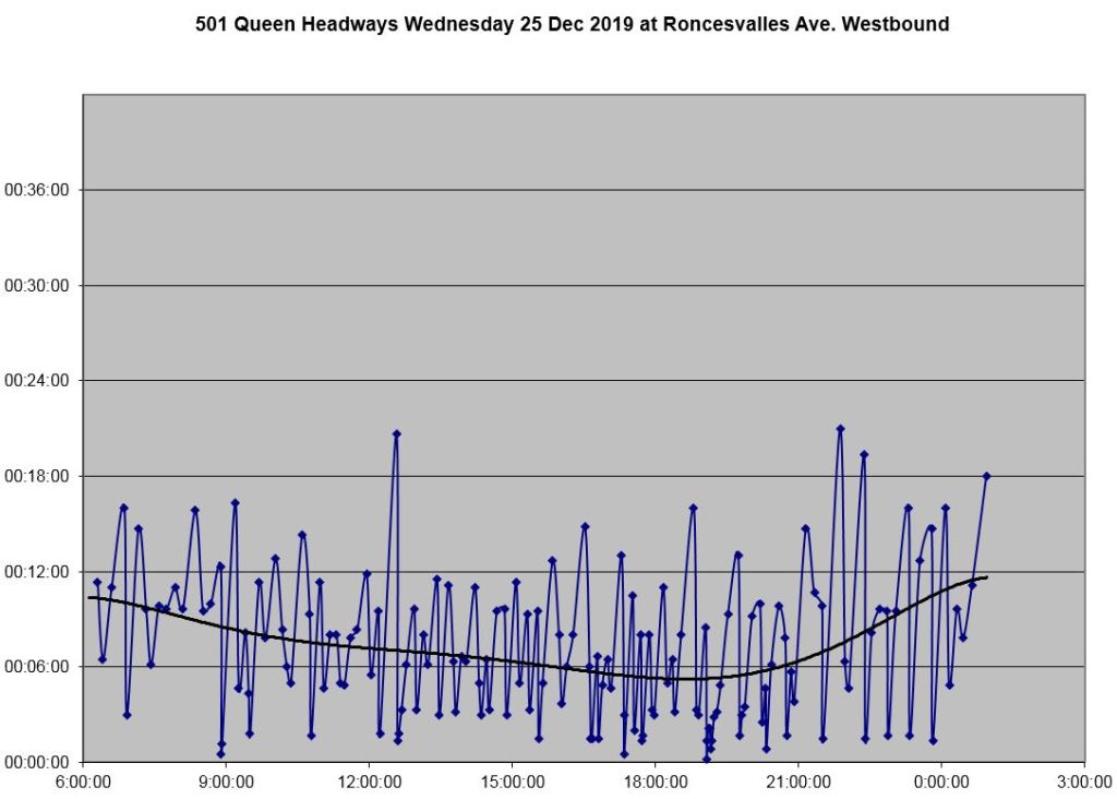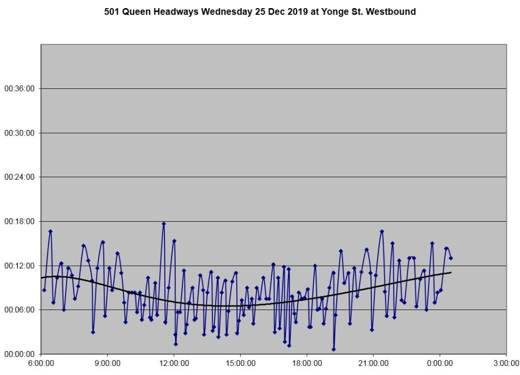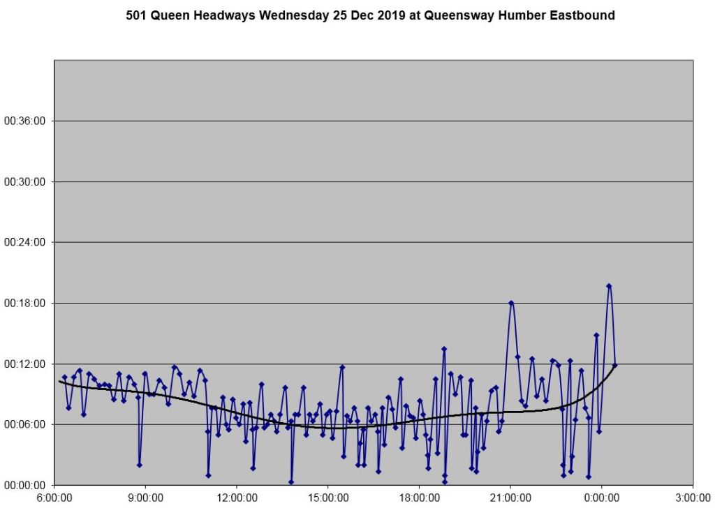 Here are the full sets of charts for Christmas Day headways along the Queen route.