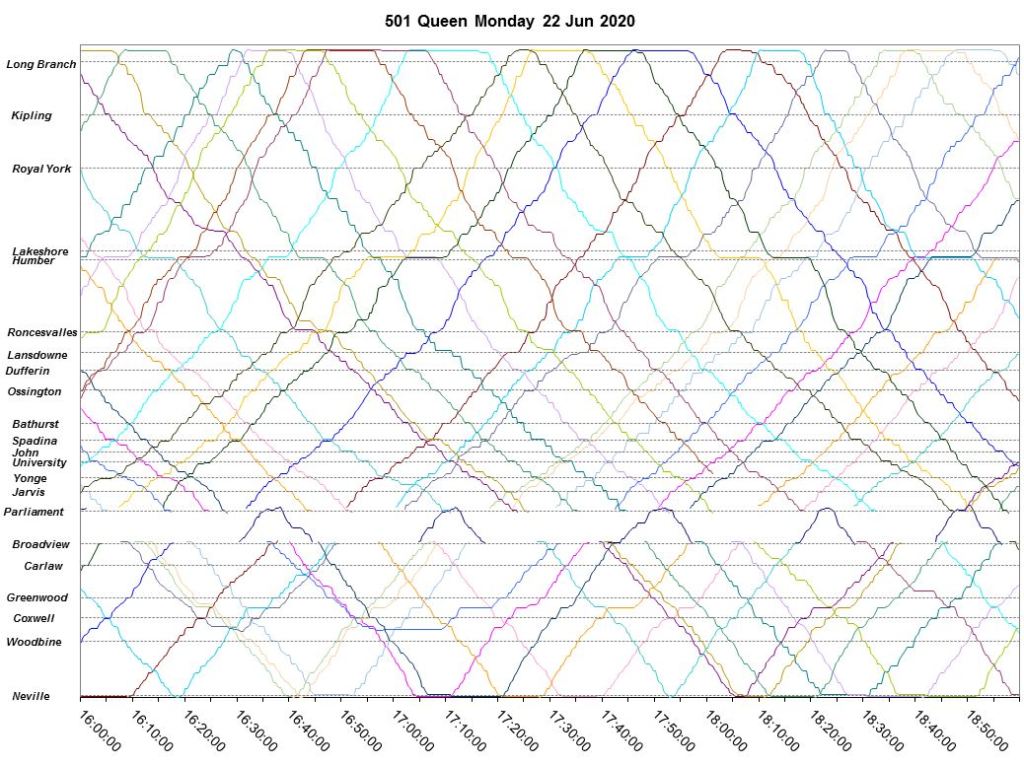 By contrast, here is the real service operated on 501 Queen during the afternoon peak on Monday, June 22, 2020. Many facets of real world operation are visible here.