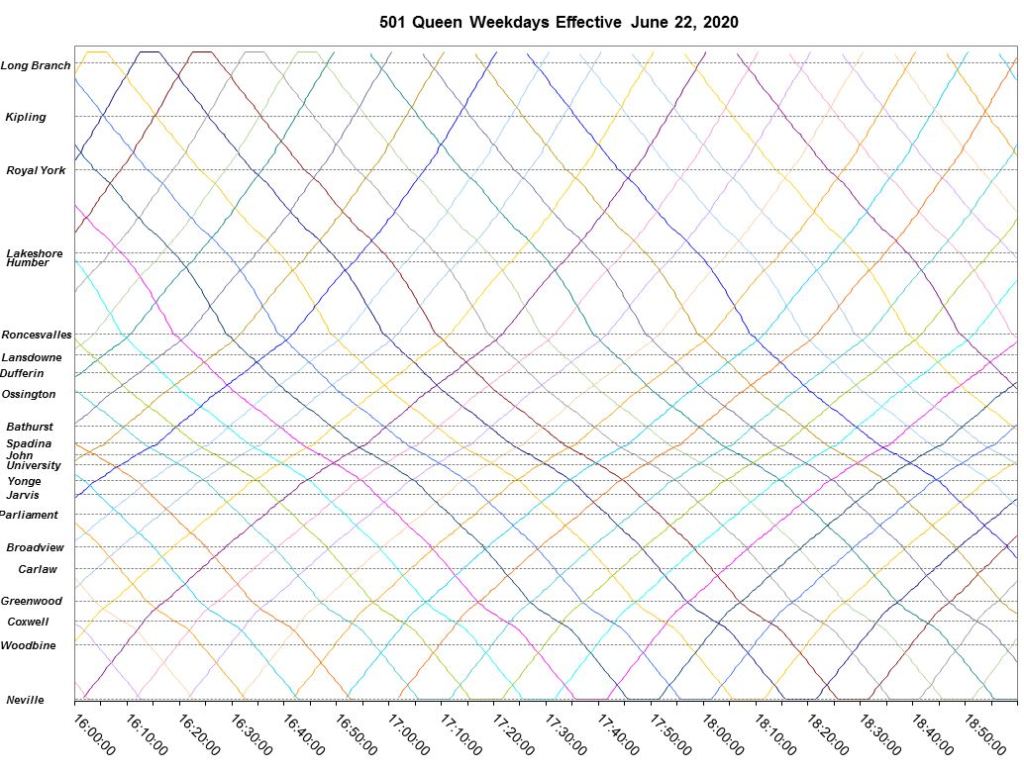 If one plots TTC service the way it is scheduled, the chart is interesting because it shows that ideal service we never, ever see. This is the afternoon peak period for the schedule that took effect on June 22, 2020. The service is quite mundane with regularly spaced cars, but it will do as an introduction.