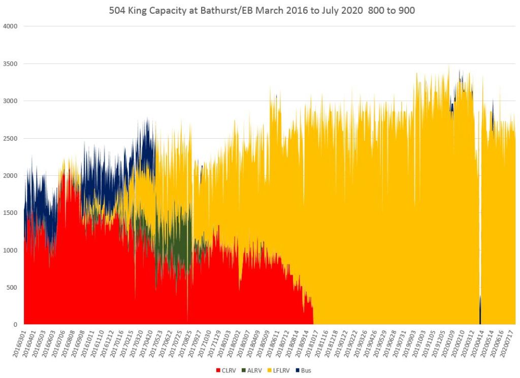The following chart shows service on King Street eastbound at Bathurst Street between 8 and 9 AM from March 2016 to July 2020. Note that the capacity of vehicles after March 2020 has not been adjusted to compensate for covid loading standards, but reflects pre-covid values.