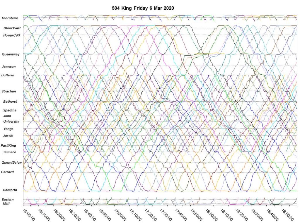 By comparison, here is the service on Tuesday, June 18, 2019 under more “classic” traffic conditions for the AM and PM peak periods. Note that at the time this route operated with CLRVs and more frequent scheduled service than in 2020 with Flexitys.