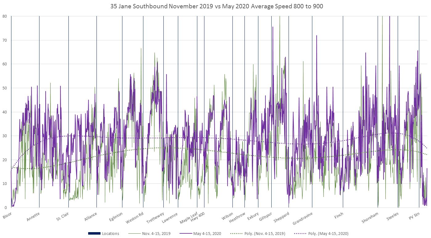Because all vehicles are tracked by GPS with reports of their location every 20 seconds or better, it is possible to know moment-to-moment how fast they are travelling. When the values are combined, we get a profile of the operating speed along a route. The chart below compares the average speed of buses on 35 Jane by location during two periods before and after the drop in traffic level in 2020.