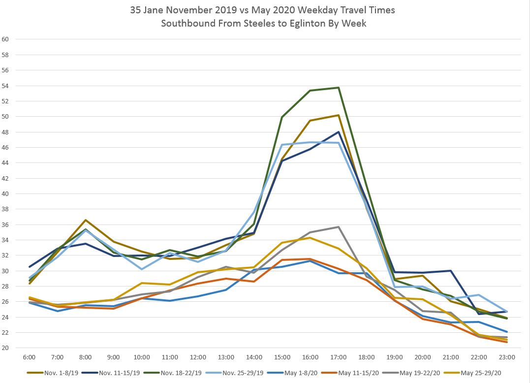 The travel time data can also be grouped by week or month to track the evolution of values. The chart below was created for a review of the effect of covid-19 on traffic congestion on the Jane corridor. These are the same weekly averages that appear in the monthly charts, but consolidated for comparison.