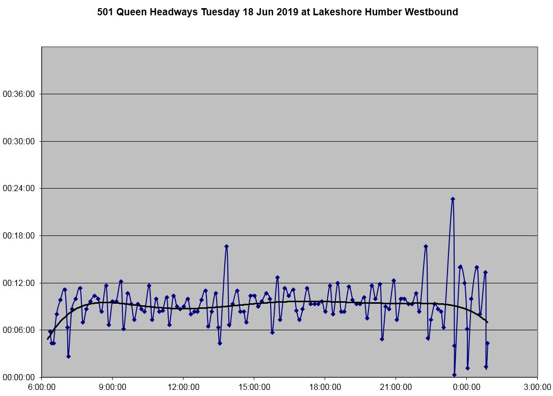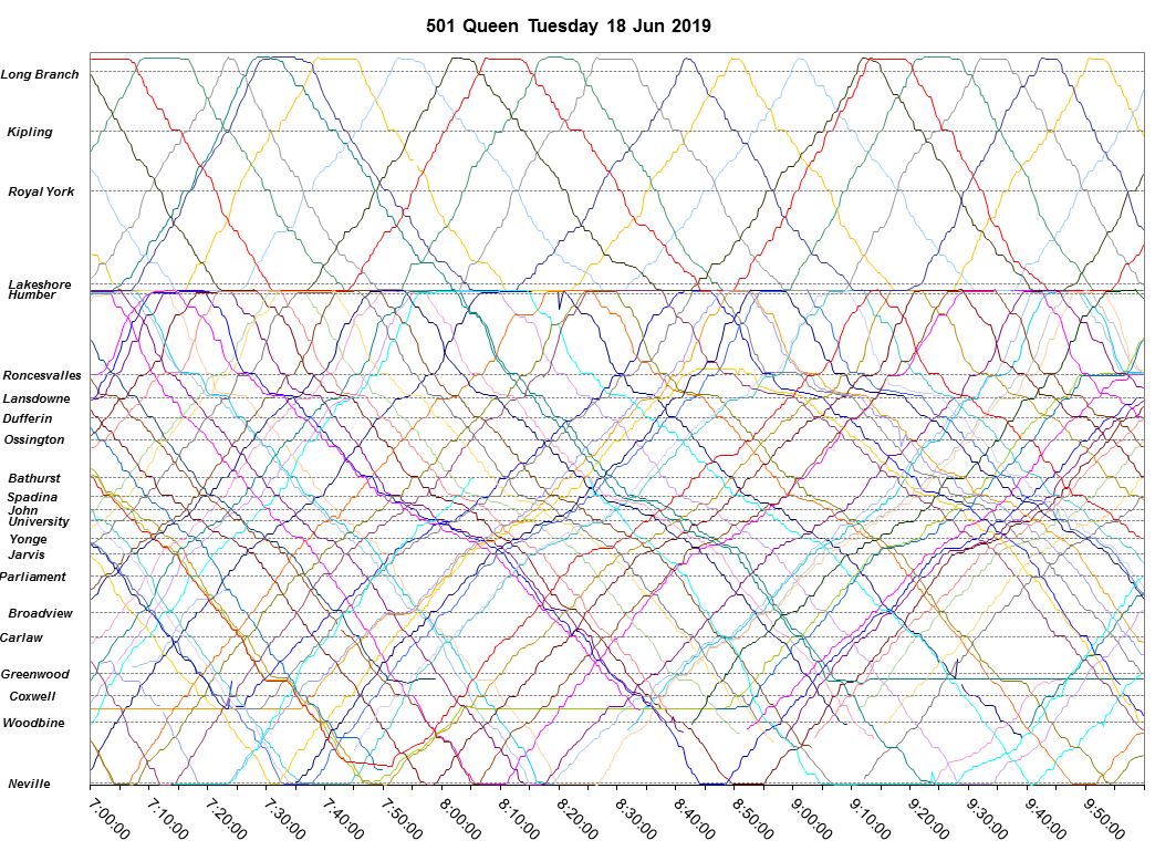 501 Queen is complex route where service is often disrupted. However, the western portion between Humber and Long Branch was better behaved when it operated as a shuttle. This shows a typical pattern for a simple route.