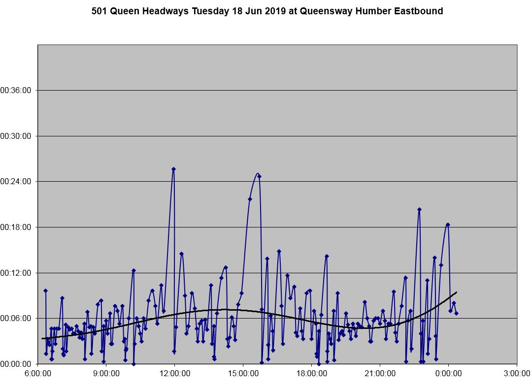 By the time this service reaches Yonge Street, the swings in headways are more pronounced.