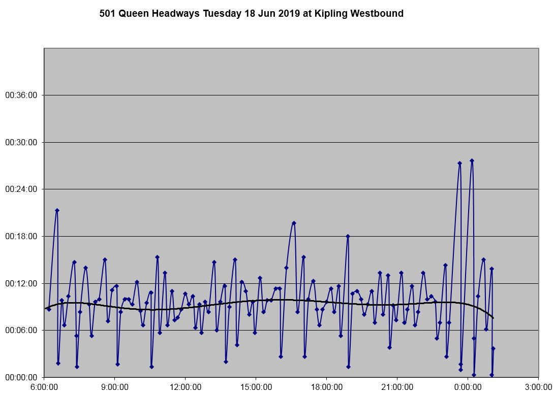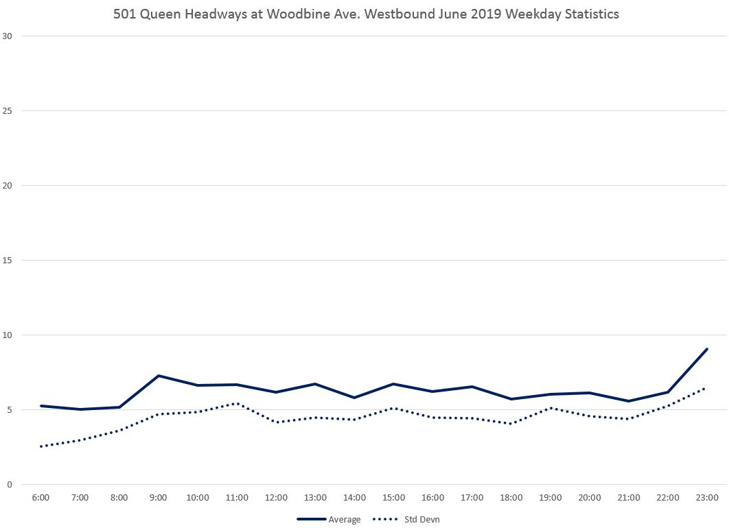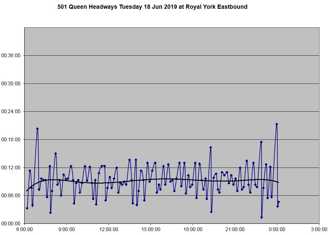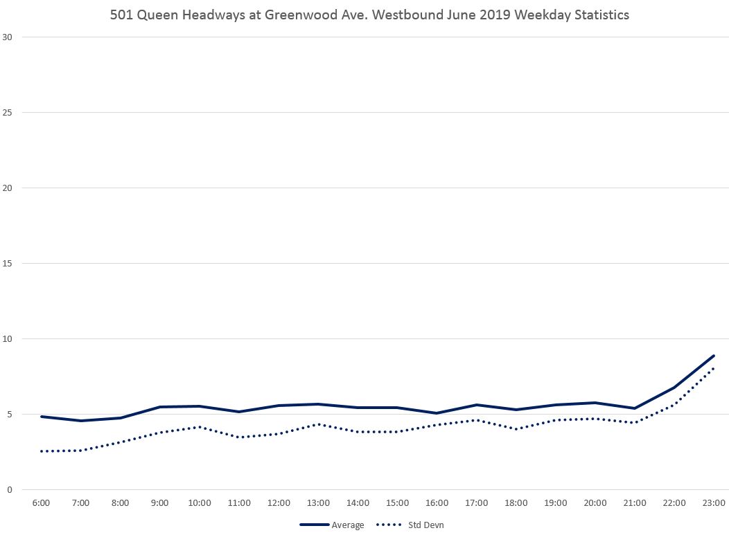 The chart below shows all trips westbound on Queen at two locations: Woodbine and Greenwood in June 2019. Time of day runs left to right, and the headway value bottom to top. Even without any formal statistical analysis, it is clear that most headways are smeared over a band from zero to ten minutes, and higher values are not uncommon.