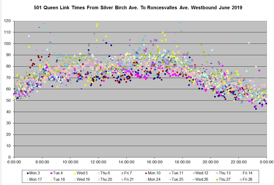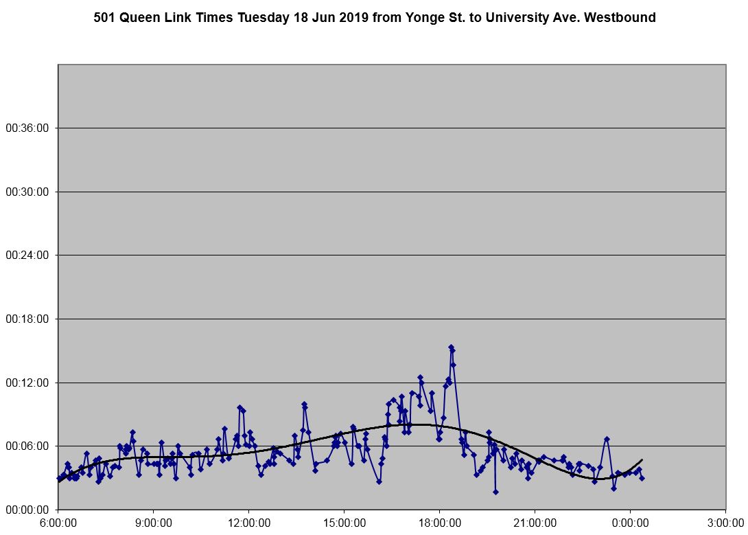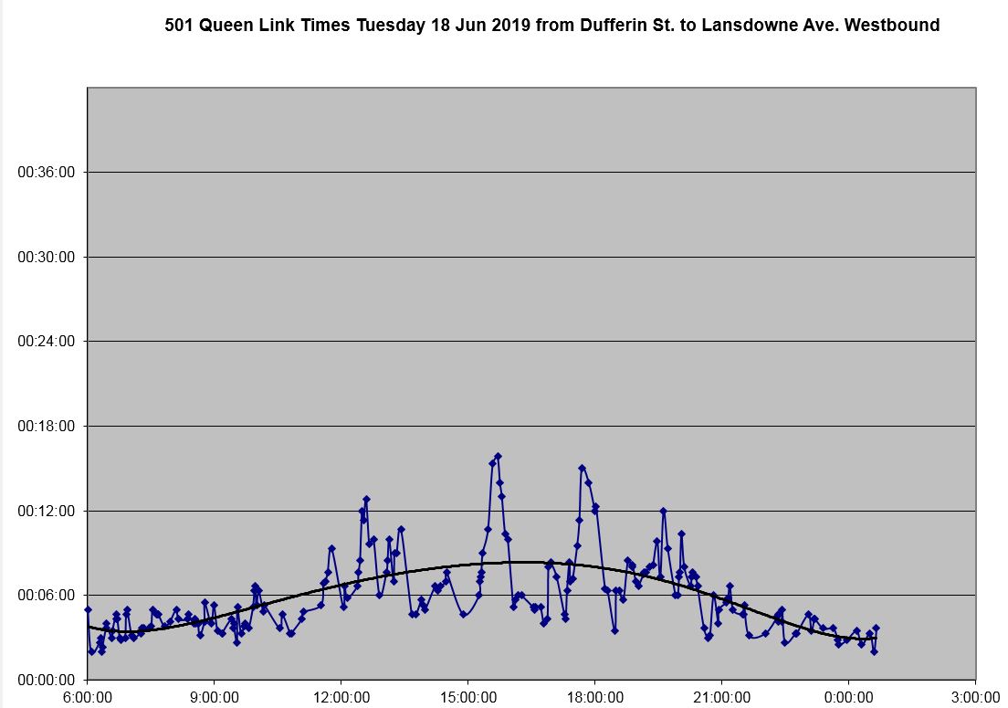 Travel times between points on a route tend to be a lot more stable than headways, although they will rise and fall depending on congestion, stop service time and special events. For June 2019, here are some examples for the following segments of the Queen car.
