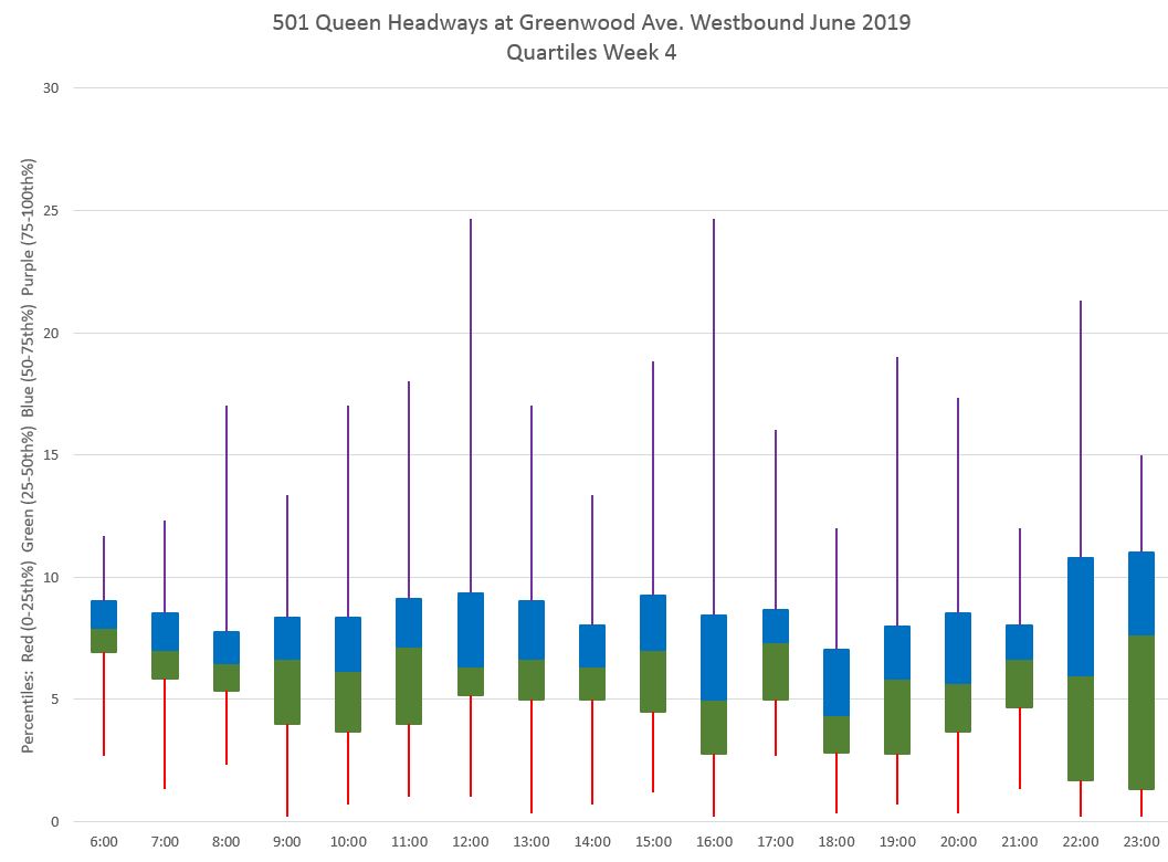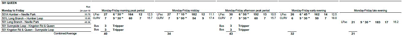 Here are the scheduled weekday headways for 501 Queen for weeks 1-3 of June, 2019, and for week 4 showing the changes (click to expand).