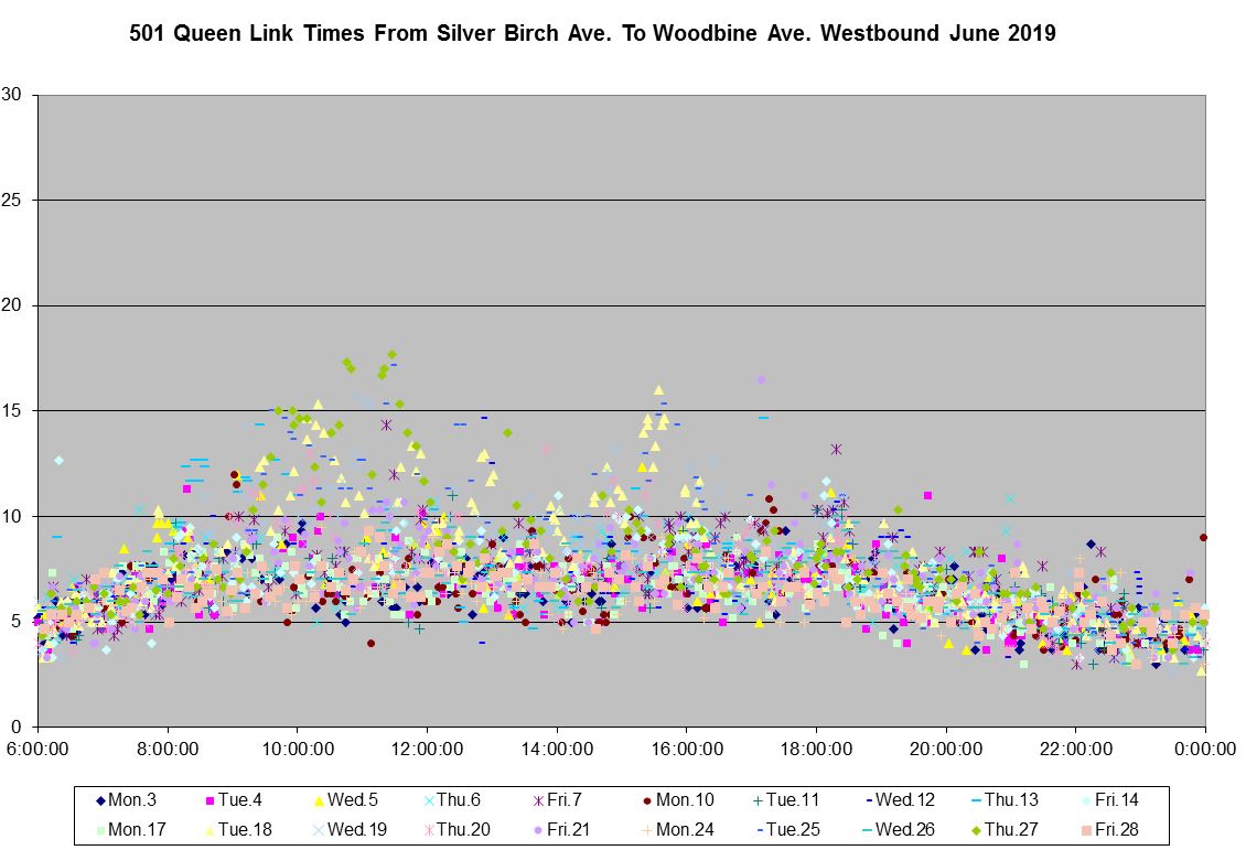 The full collection of data points shows that even through The Beach to Woodbine there is a band about 5 minutes wide which is rather large considering that the average lies near 8 minutes. Between the peaks, this can get worse. The light yellow triangles are data for June 18 for which a detailed service chart is linked earlier in the article, and which shows that the congestion built up westbound to Woodbine. The green diamonds are for June 27 when a similar problem developed after the AM peak until after noon. This is an example of how conditions are not always the same on a route from day to day.