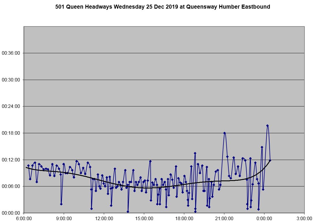 Here are the full sets of charts for Christmas Day headways along the Queen route.