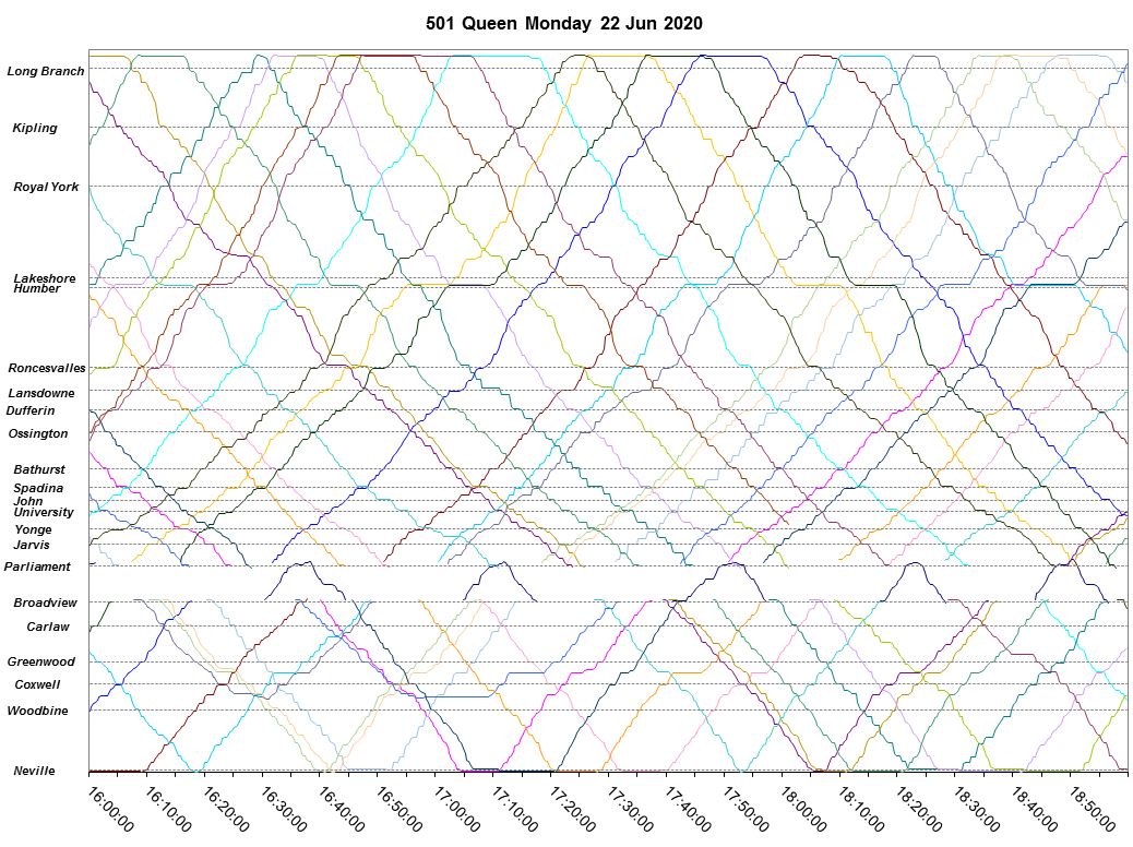 By contrast, here is the real service operated on 501 Queen during the afternoon peak on Monday, June 22, 2020. Many facets of real world operation are visible here.