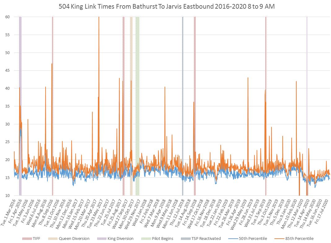 The chart below shows travel times on weekdays from March 2016 to July 2020 on King between Bathurst and Jarvis. In this case rather than showing the quartiles, the chart tracks the 50th percentile (median) and the 85th percentile. Two major changes in the character of the data are visible: