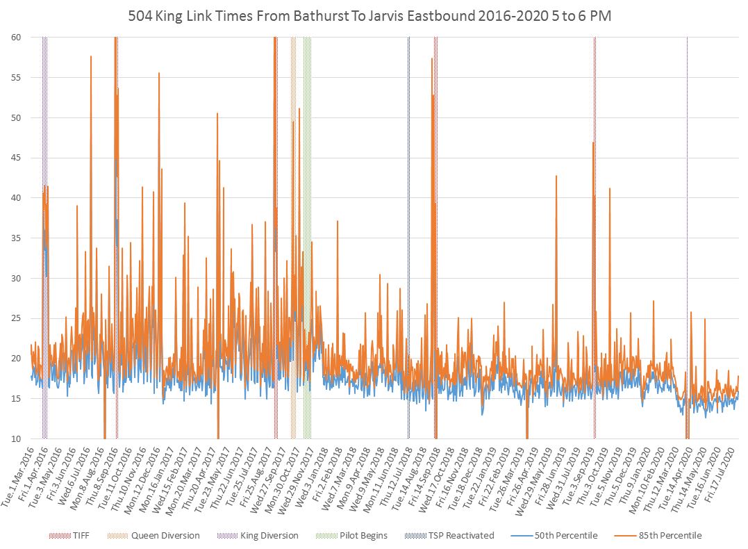 - At the beginning of the pilot, November 2017, there is a slight reduction in the values but a big decrease in the day-to-day swings in effect “clipping” off the tops of very large spikes in the pre-pilot era (except during events that undid the benefits such as TIFF).