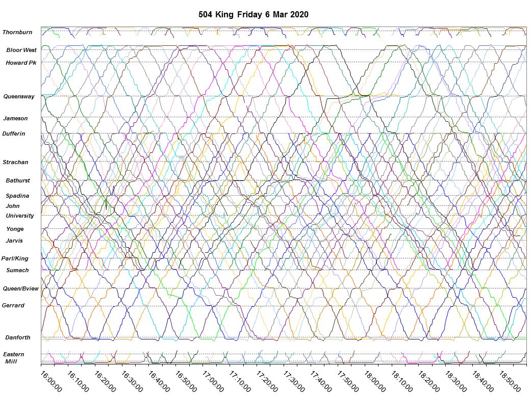 - A diversion between Broadview and Parliament shows up as a break in the chart because the “map” I used to plot service only includes the standard portion of the route. The shuttle bus shows up making a round trip across the gap now and then with siestas between each trip.